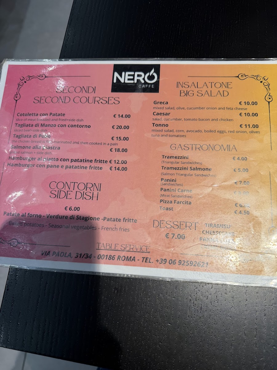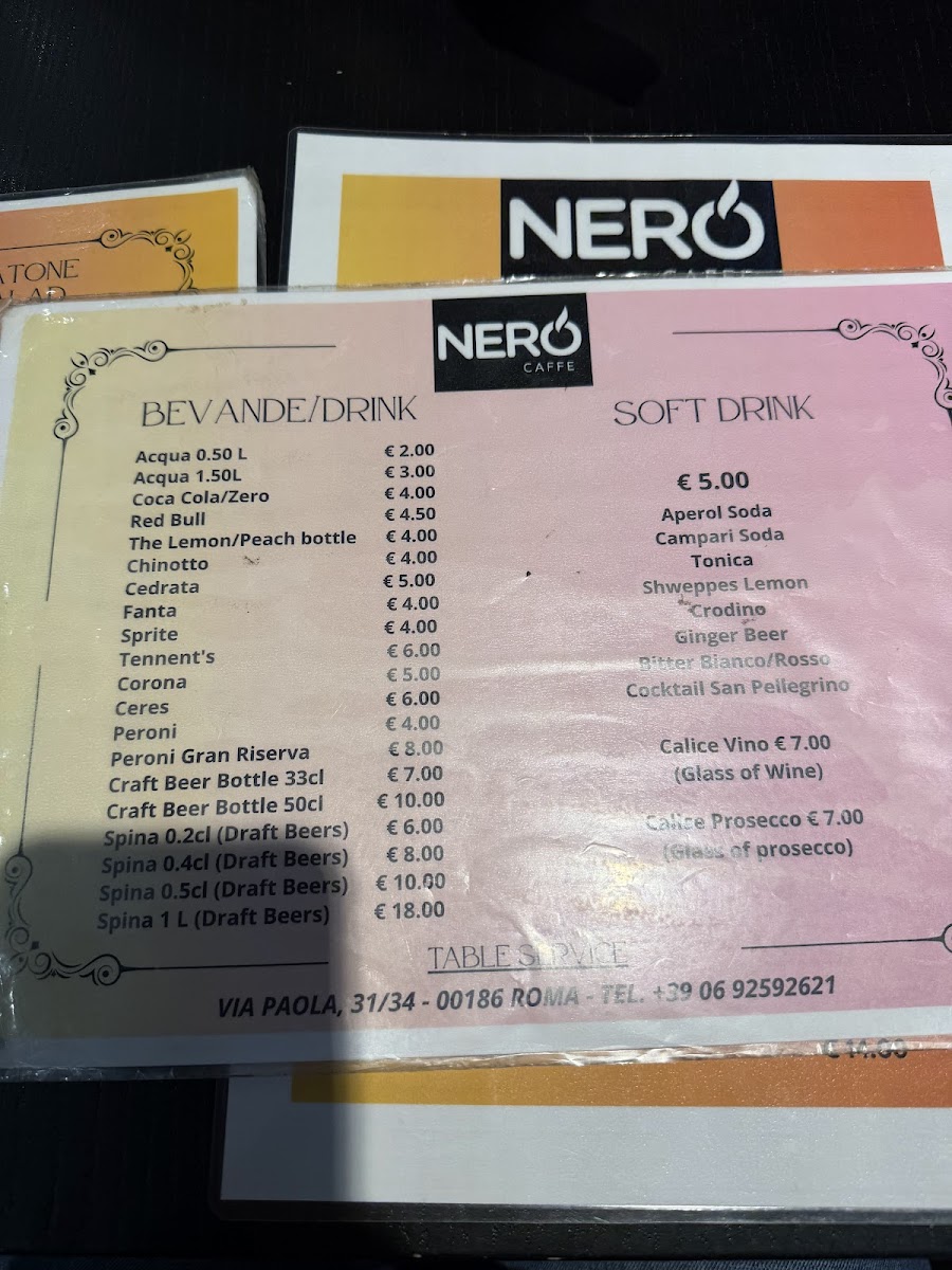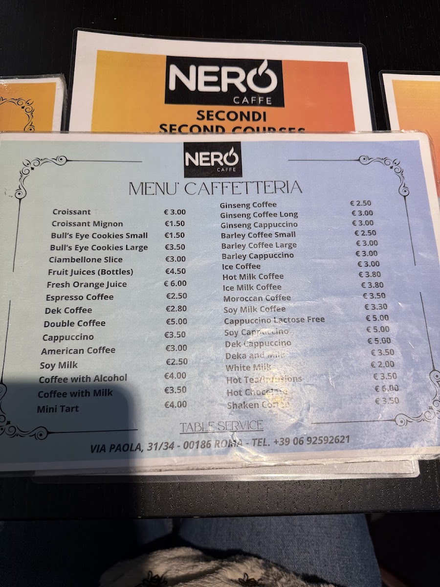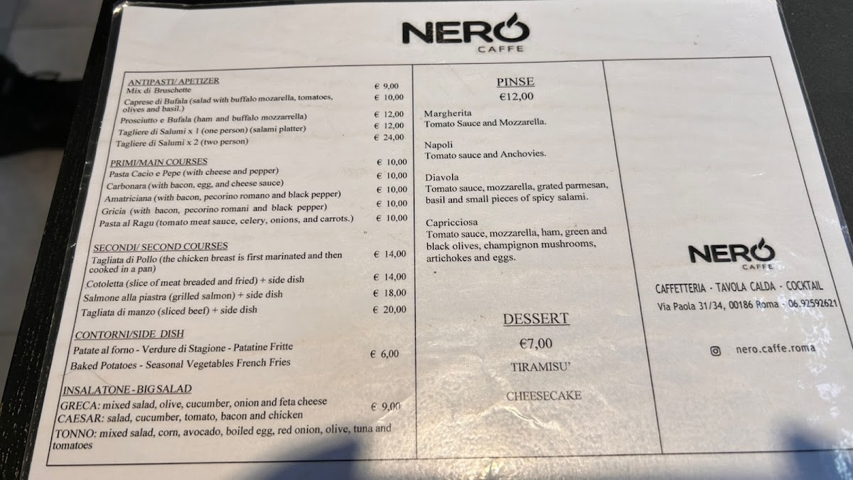 Bar Nero Caffé, nestled near the Vatican on Via Paola in Rome, offers an inviting blend of authentic Italian flavors and cozy ambiance. This vibrant spot excels not only as a coffee shop but also as a deli, pastry shop, bar, and restaurant, making it a versatile stop for any craving. Their menu shines with highlights like the rich, creamy Pasta Carbonara—hailed as some of the best in Rome at an unbeatable price—and hearty dishes such as steak with a luscious wine sauce, both drawing enthusiastic praise.